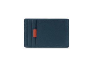Leather credit card case. Saffiano-look embossed leather, satin lining. Three compartments on the front, three on the back and one side compartment. Contrasting orange, blue dust bag included. 7x11 cm.